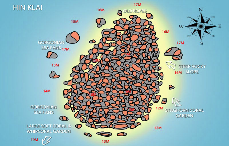 Hin Bida is a partially submerged pinnacle located in the open sea about 3.5 miles southeast of Koh Bida Nok / Nai. The rock barely breaks the surface during low tide and disappears underwater at high tide. The sloping reef is covered by healthy hard and soft corals with abundant marine life. On the sandy flat bottom around the pinnacle is possible to spot Leopard Sharks.