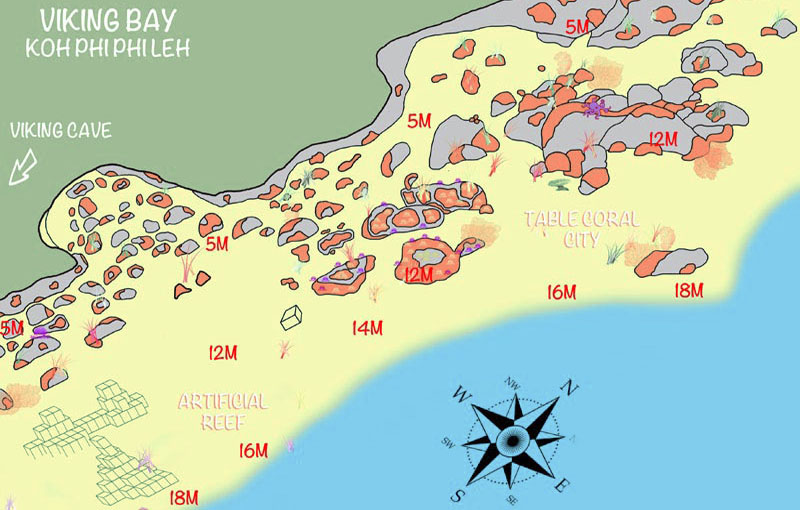 Viking Bay is an easy Phi Phi dive site located along the east coast of Phi Phi Leh Island, right next to the popular Viking Cave. The site splits between a large artificial reef laying on a sandy bottom and a natural reef with lively marine life. The shallow depth and protection from currents make Viking Bay a perfect Phi Phi Islands dive site for sunset dives and training dives.