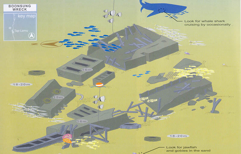 Boonsoong沉船和Premchai(上图)以及其他许多可以在普吉岛和Khao Lak附近的海底发现的挖泥船是同一类型的锡矿开采船。与Premchai不同,Boonsung在1985年意外沉没,也有传说是因为保险欺诈。这艘沉船现在已经非常破旧,但海洋生物的数量之多令人难以置信。