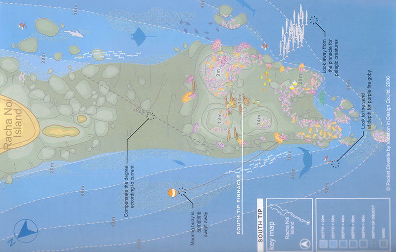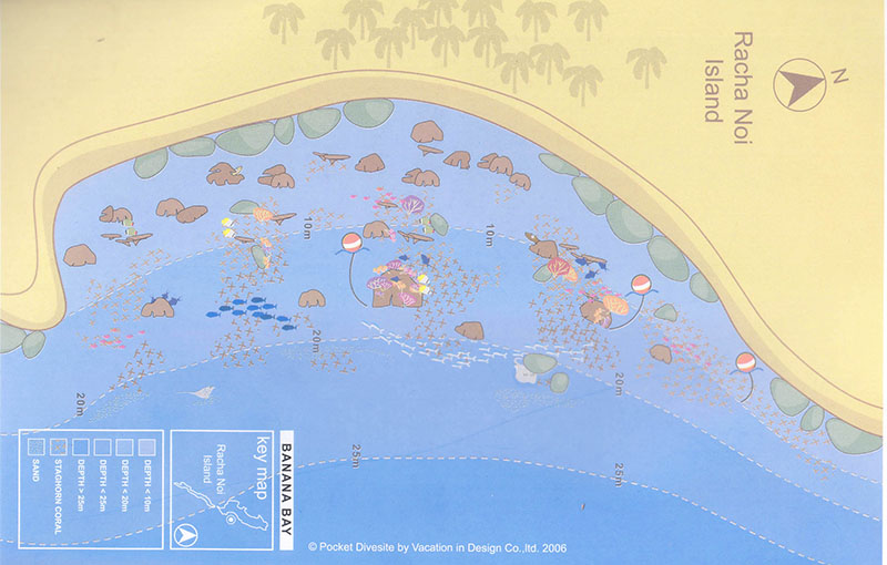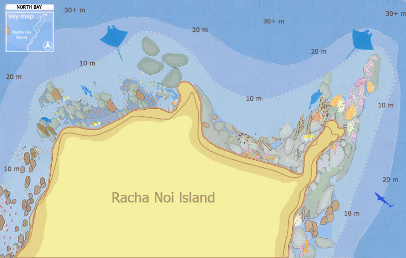 北部海湾,顾名思义位于Racha Noi的北边。不同深度,景观各异,适合所有级别的潜水员。近岛的水域很浅,西侧有一片倾斜的礁石,有很好的硬珊瑚覆盖其上,而东侧有一个岩石尖顶,从岛上一直延伸到水下40多米深。