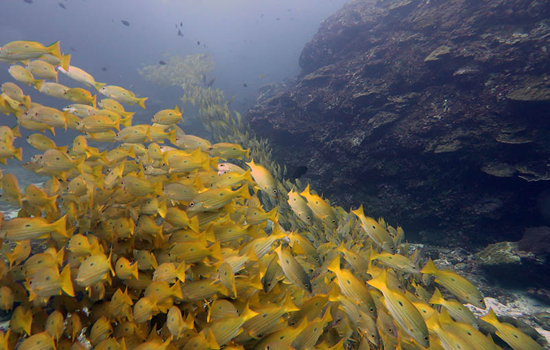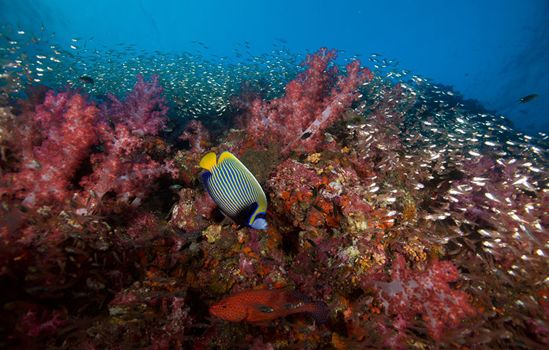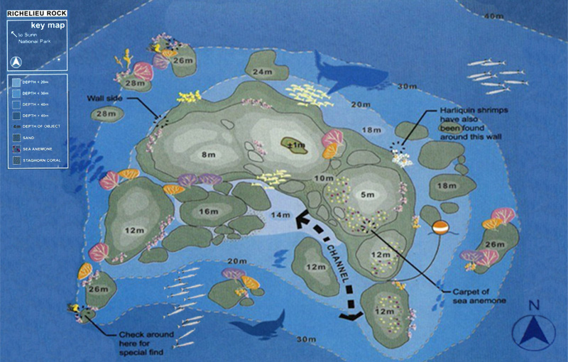 关于黎塞留巨岩的命名有许多传说。最被流传的一个认为是法国海洋探险家雅克·库斯托命名了该巨岩。由于这块巨岩被层叠繁茂的紫色软体珊瑚所覆盖,立即令他联想到大仲马的长篇小说《三个火枪手》里的红衣主教黎塞留。黎塞留巨岩是一块硕大无朋的马蹄形石峰,坐落在Surin群岛东方10公里处。这里年平均水温约27~29度,能见度30米以上,是非常著名的赏鲸名胜地。除了体形巨大的鲸鲨,这里还有海龟、海蛇、梭鱼、各种海葵及形色各异的海绵。这里是五彩斑斓的海底花园,丰富的珊瑚种类,鱼群密密麻麻。由于这里海洋生物的数量惊人,MV Giamani安排的行程中,都会在此安排三次潜水。第一次潜水是在东边较深的地方,第二次潜水是在西边较深的地方,最后一次潜水是在浅层的顶峰附近。很难用语言来描述黎塞留巨岩,你应该亲自来看看,被选为全球十大潜水圣地完全名副其实!