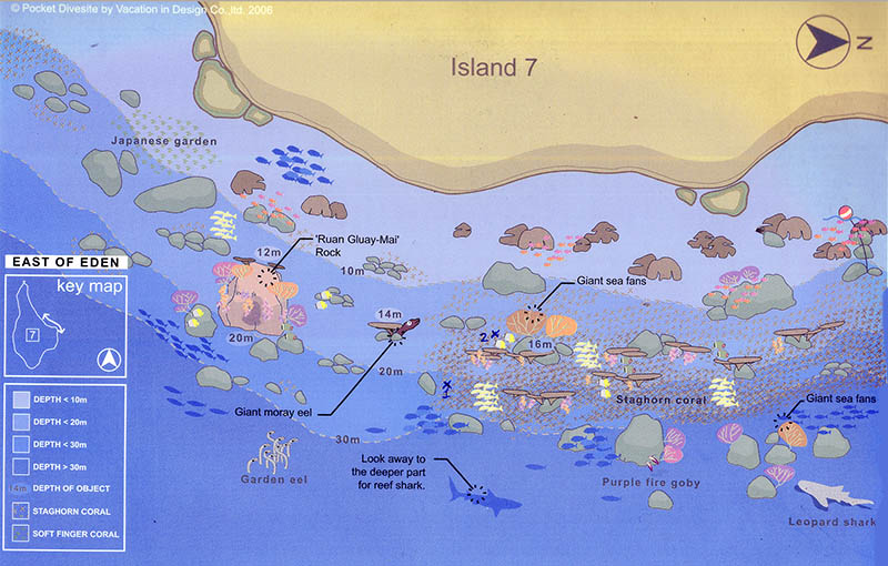 伊甸以东位于7号岛东侧,曾经是斯米兰群岛最受青睐的潜水点。出于生态保护的需要,该潜水点被关闭,开放时间待定。这里布满珊瑚,满眼海底生物,往复络绎不绝。