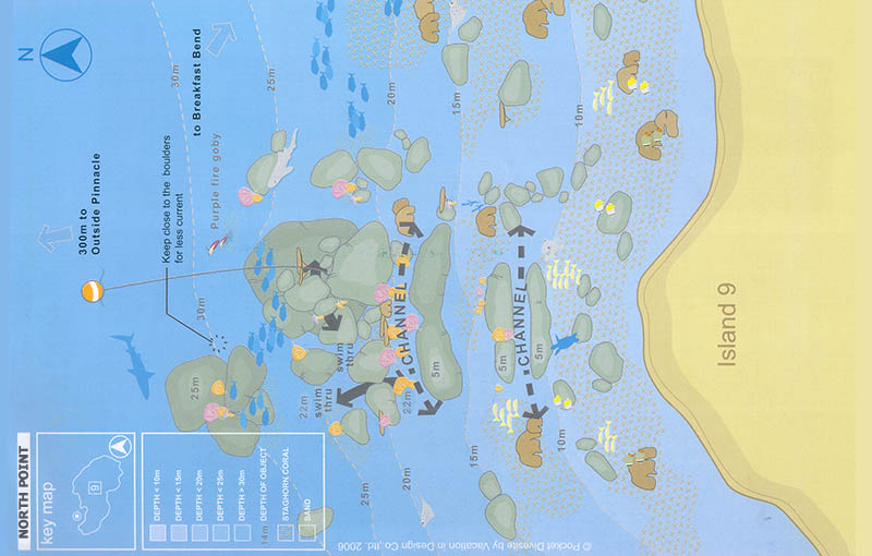 北角,位于9号岛最北边,和斯米兰群岛其他的潜水点一样,由一系列花岗岩巨石组成。巨石与9号岛之间珊瑚鱼群繁多,水较浅。巨石的另一侧,深度陡增,白鳍鲨经常在这里的海底游弋或休息。
