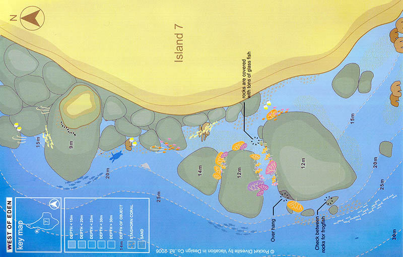 伊甸以西是斯米兰群岛比较受欢迎的潜水点。该潜水点位于7号岛的西侧,这里的海洋生物物种繁多。潜水点的南部是一片略带坡度的珊瑚花园。向北游去,是层峦叠嶂的花岗岩巨石,各色扇形珊瑚覆盖其上。静谧而生机勃勃,由此被命名为伊甸以西。